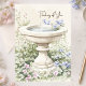 Send a heartfelt message with this elegant Thinking of You greeting card, featuring a soft watercolor illustration of a classic stone fountain surrounded by delicate garden florals. Designed in a romantic cottagecore style, the artwork blends gentle blush pinks, dusty blues, and fresh greenery against a warm, lightly textured background for a timeless, serene look.