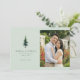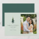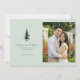 This wedding save-the-date card features a split layout with a light green background on the left, showcasing a beautifully detailed illustration of a coniferous tree. The right side displays a candid photograph placeholder of a couple in a garden setting, surrounded by vibrant red flowers and lush foliage. The design combines classic elegance with nature-inspired simplicity, using a soft color palette of greens, whites, and red accents. Elegant serif typography is used to convey essential details, creating a warm and celebratory mood perfect for announcing an upcoming marriage.