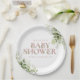An elegant baby shower paper plate featuring chic dusty rose pink typography and pretty botanical greenery foliage. Designed by Thisisnotme©