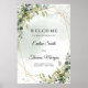 Simple boho design for wedding welcome sign aisle poster features lavish watercolor green eucalyptus leaves mixed greenery foliage woven into faux gold frame. Elegant script typography.
