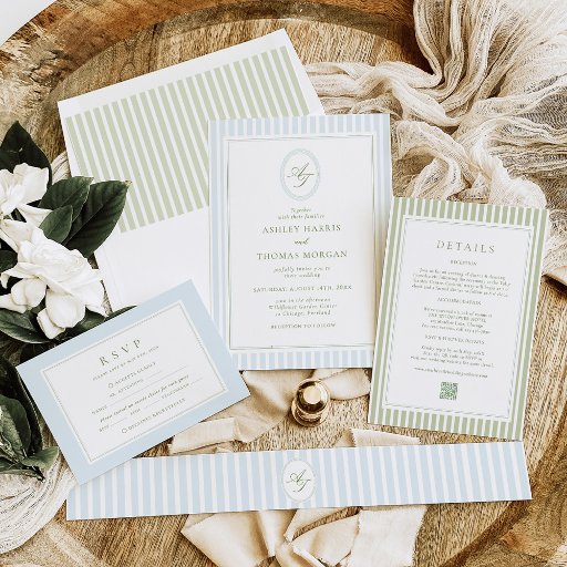 Elegant Blue & Sage Striped Wedding Save the Date