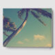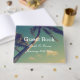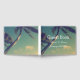 Elegant guest book for intimate beach wedding. Elegant template with classy typography and curved palm tree photo. Beautiful templates for couples getting married in summer or dreamy coastal locations. Part of affordable collection set with amazing decorations and classy stationery. Personalize with names of bride and groom. Blue and green retro color palette.