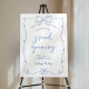 Introducing elegant hand-drawn Business Grand Opening Welcome Sign design, featuring whimsical ribbons and delicate frame in sophisticated blue and white color scheme. Create professional sign for your launch party or grand opening event with this unique easel foam board design.
