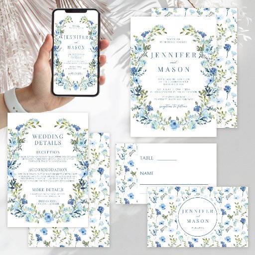 Elegant hand drawn blue floral wedding menu cards