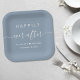 Elegant dusty blue paper plates for your wedding reception, engagement parties, rehearsal dinner, couples showers and other wedding celebrations featuring "Happily Ever After" in simple white typography and a chic white script with swashes, your first names joined by a heart and your wedding date.