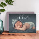 An elegant birth announcement design featuring a full bleed horizontal or landscape oriented photo with "introducing [name]" at the top in chic white calligraphy script and classic serif lettering. Your baby's full name, birth stats, and your family signature appear along the bottom. Add three additional square photos to the back.