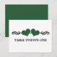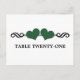 Sweet and whimsical Elegant Hearts Wedding Table Number Postcard featuring a fancy swirl border adorned with a pair of emerald green hearts. This modern table card is the perfect choice for a chic and elegant wedding. Easy to customize, simply add the appropriate table number(s) in the text field provided. Click "Customize It" to find additional personalization options.