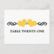 Sweet and whimsical Elegant Hearts Wedding Table Number Postcard featuring a fancy swirl border adorned with a pair of lemon zest yellow hearts. This modern table card is the perfect choice for a chic and elegant wedding. Easy to customize, simply add the appropriate table number(s) in the text field provided. Click "Customize It" to find additional personalization options.