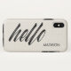 The word "hello" in a modern black cursive script font takes up two thirds of the elegant case with a beige printed faux canvas texture background. A custom name is at the lower right in a smaller simple black sans serif font. Personalize it by adding your name or text in the sidebar. Make a great customized gift.