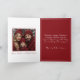 Homey Christmas Card with a pretty wooden front door with a pretty Christmas wreath, decorated with gold ornaments, pine cones and red holly berries. Pretty Christmas trees stand on each side of the door.