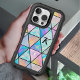 Elegant holographic chic geometric iPhone 16 Case. This iPhone case features an abstract pattern of holographic triangles that shimmer with an iridescent glow, shifting from pink to blue to yellow as light moves across the surface. The geometric design creates a modern, high-tech feel, with each square adding depth and a touch of mystique.