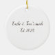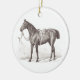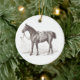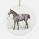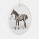 Stylish horse ornament personalized with the names and date of establishment of your favorite horse loving couple. The front is illustrated with an elegant engraving of a saddled horse, the back printed with the fully editable text " name1 & name2's ranch, Est. YEAR". Perfect as a housewarming present for your rider friends.