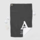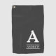 This simple and elegant golf towel design features a personalized monogram/initial letter, along with a customizable name between lines, on a gray background, It could be a great gift for somebody who enjoys playing golf.