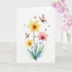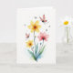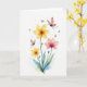 Designed with a soft watercolor look on a white background, the card centers on a small bouquet that feels like a gentle gift shared between close hearts ❤️. Two sunny yellow flowers and one blush-pink flower sit near the middle, each with a dark round center that draws the eye like a quiet, affectionate gaze. Green leaves gather at the bottom, and thin stems rise upward with tiny buds in pale blue and peach, suggesting something tender growing. A pair of coral winged insects outlined in fine dark lines hover nearby, angled toward one another as if meeting midair. Above them, a few lighter line-only insect shapes drift, adding a breezy, carefree motion that reads like friendly company. The main text sits above the flowers in a soft gray tone, with a smaller line of text placed below the stems in muted pink 🌼. Light, diluted paint speckles pool near the lower edge, fading softly outward from the base of the leaves.