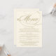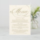 Elegant and formal wedding dinner menu cards feature champagne gold calligraphy script and custom text that can be personalized. Ivory background color.