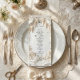 Elevate your luxury estate reception with this sophisticated dinner card, featuring a romantic, faux plaster relief design of an ornate arch and wisteria.Immerse your guests in the romance of a European estate with this artfully composed design. The visual aesthetic mimics the tactile beauty of a 3D bas-relief sculpture, rendered in a soothing monochromatic palette of creamy ivory, soft beige, and antique off-white. An ornate architectural arch, draped in hanging wisteria blooms, frames a serene pastoral landscape featuring a charming bridge, trees, and a pair of white doves, all unified by a simulated white plaster texture. The text is presented in a mix of classic serif and flowing script for a timeless finish.This is a flat printed image with a Faux Plaster Relief effect, not actual raised material or embossed paper.