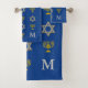 Elegant, monogrammed Jewish-themed bath towel set, showing faux gold and silver STAR OF DAVID and MENORAH in a tiled pattern against an Israeli blue background. The bottom right hand corner has a CUSTOMIZABLE MONOGRAM so you can add your own initial. Ideal for Hanukkah and other Jewish-themed home decor. Choose from a wide selection of Jewish-themed cards, gifts, home decor and party supplies by Berean Designs. Also available in other colors.