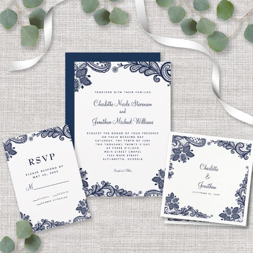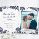 This design features a crisp white background with ornate navy blue lace in the corners on back and front. One side of the design features a modern template to easily add custom engagement photo, the couple's first names and future wedding date. On reverse side, personalize Save the Date wedding design with your names & custom details in elegant blue lettering and script.