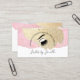 © 2023 Socialite Designs Inc. & LICENSORS. This elegant lash extension business card design incorporates a gold and pink background, eye with brow and long lashes design elements (can be deleted and your own logo added), and curved text to catch the eye. An elegant business card that can be used for all beauty and makeup artists.