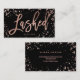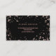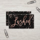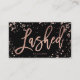A modern, stylish Lashed lashes, eyes makeup artist business card with modern hand lettering style brush typography in faux rose gold foil on a rose gold confetti splatters with customizable black background.
