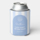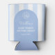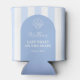 Customize your coastal-themed bachelorette party with our stylish can cooler featuring a whimsical hand drawn scallop shell against a simple and elegant arch and blue and white stripe background.