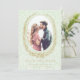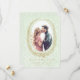 This pink save the date is perfect for announcing your upcoming wedding date. The design features an antique laurel wreath frame around your engagement photo. The design is on a light green damask background.