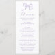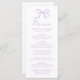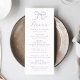 Create a dreamy and whimsical table display with this lavender bow wedding menu. A hand-drawn bow in lavender sits above the word "Menu" written in graceful calligraphy, setting a romantic tone. Customize with your names, wedding date, and dinner details for a personal, polished look. This design is ideal for spring weddings, garden parties, or romantic celebrations with a soft purple color scheme.