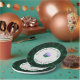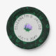 Paper plates featuring graphic-style Lavender camellia flower, off white background with a green border, and a floral background. Text is customizable. Look for matching wedding products.