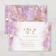 The edges of this elegant modern RSVP card features a lavender watercolor border design in imitation of marble veined with faux gold foil, fading gradually into the white background. The letters "rsvp" appear in gold-colored handwriting script. The customizable response date and wording are in charcoal gray serif text. The reverse side features a matching lavender and gold marble design.
