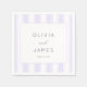 These wedding napkins feature a clean and elegant design with vertical lavender and white stripes, creating a serene and sophisticated atmosphere. The central rectangular frame highlights customizable names in bold serif fonts, complemented by a cursive "and" for an added touch of elegance. The minimalist style focuses on clarity and simplicity, making it perfect for formal occasions. The soft color palette and balanced layout convey a mood of calmness and anticipation, ideal for celebrating your special day.