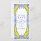 Lemon theme wedding save the date featuring illustrations of lemons, Mediterranean-inspired frame. Personalize by adding names, date, time, and other details. This lemon wedding save the date is perfect for summer weddings and Mediterranean-themed events.