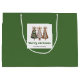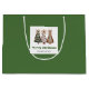 Minimalist watercolor christmas tree gift bag with playful leopard pattern in earthy green and gold. Personalize with your custom name for a stylish Christmas gift presentation.
