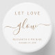 Elegant white keepsake mini candles for your wedding favors featuring "Let Love Glow" in simple gold typography and a chic modern gold script with swashes and your names and wedding date in classic serif typography.