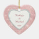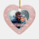 This elegant ornament features your special photograph within a faux diamond heart shaped frame against a pretty jewel like lighter pink background with tiny star lights. Your text is in white on a light pink banner that is framed in gold. The back of the ornament has a heart shaped white field with more text fields for you to customize. A beautiful keepsake for that very important First Valentine's Day together!