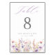 Elegant Lilac Wildflowers Wedding Table Number with lilac headline "table" in calligraphy font. Personalization is in grey serif font.