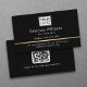 Modern, elegant, black business cards with your custom logo, and QR code on the back. On the front is a printed golden color gradient dividing line (not real foil). Fonts, font colors and background colors can be changed with the design tool.