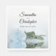 These beautiful wedding napkins will add style and class to your reception, rehearsal dinner, or other wedding related event. They feature a simple yet elegant and romantic design with a single long-stemmed pale dusty blue colored rose reflecting in a pool of water with waves and ripples. Above the rose are the names of the couple and wedding date.