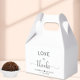 Elegant wedding favor box featuring "love + thanks" in simple modern typography and a stylish script, your first names joined together by a heart and your wedding date.