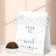 Elegant white favor box for your wedding featuring "Love Is Sweet" in simple modern typography and a stylish script with swashes, your first names joined together by a heart and your wedding date.
