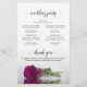 These wedding programs are elegant and tasteful, while still being budget friendly. The design features a single long-stemmed cassis purple, magenta, or berry colored rose lying on its side, reflecting in a pool of water with waves and ripples. The typography features lacy black script calligraphy, and there is room for details on the ceremony, the bridal party, and a short thank you.