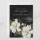 An Elegant Wedding Invitation designed with a White Magnolia illustration on a black background. The back of this card can be customized with your favorite portrait oriented photo. Matching items in our store Cava Party Design