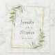 The names of the bride and groom and the wedding date are framed with a gold geometric frame and sprigs of watercolor greenery, on this elegant wedding wine label.