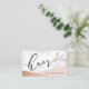 Modern and elegant business cards for hairstylists with faux rose gold scissors, blush pink & rose gold color block, white marble texture and elegant calligraphy font.