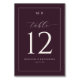 This elegant wedding table card features a deep maroon background with crisp white text, creating a sophisticated and formal atmosphere. The design showcases a clean serif font for the initials "M" and "K," complemented by an elegant cursive script for the word "table." Dominating the center is the bold number "12," ensuring easy identification of your seating arrangement. Customizable placeholders allow for personalization with names and dates, making it perfect for adding a personalized touch to your special day. The minimalist yet refined aesthetic makes this card ideal for weddings seeking a classic and polished look.