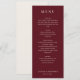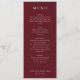 This elegant wedding menu features a vertical layout with a rich maroon background, creating a sophisticated and formal atmosphere. The design uses clean typography, with bold serif headers for sections like "STARTERS," "SALAD," "MAIN COURSE," and "DESSERT," while the menu items are presented in a neat sans-serif font. The overall style is classic and refined, perfect for a luxurious event, with a focus on clarity and simplicity. Personalization options allow for custom names and dates, making it ideal for celebrating special moments such as weddings.