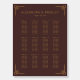This elegant wedding seating chart features a sophisticated maroon background with gold accents, creating a luxurious and formal atmosphere. The design includes neatly organized columns for table assignments, framed by intricate geometric motifs that add a touch of refinement. With customizable placeholders for names and dates, this template is perfect for couples seeking a classic and timeless aesthetic for their big day. The clean layout and harmonious color palette ensure clarity and style, making it an ideal choice for any wedding celebration.