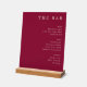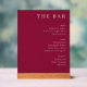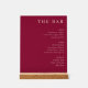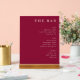 This elegant wedding menu card features a sophisticated maroon background with crisp white text, creating a striking contrast. The layout is clean and organized, showcasing sections for beer, wine, and spirits in an easy-to-read serif font. Its minimalist design emphasizes typography, conveying a refined and modern aesthetic perfect for any upscale event. Ideal for weddings or formal gatherings, this menu exudes class and simplicity, making it a versatile choice for those seeking a timeless look.