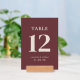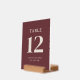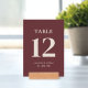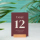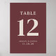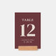 This elegant wedding table card features a deep maroon background with crisp white text, creating a sophisticated and modern look. The design includes a large number "12" in a serif font, accompanied by customizable placeholders for names and dates in a clean sans-serif style. Its simple layout emphasizes clarity and focus, making it perfect for formal events where clear communication is key. The overall mood exudes elegance and simplicity, ideal for adding a touch of class to your wedding reception.