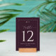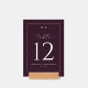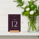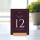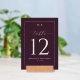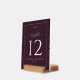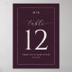 This elegant wedding table card features a sophisticated maroon background with crisp white text, creating a timeless and formal aesthetic. The design showcases a symmetrical layout with clean serif fonts that highlight the table number "12" as the focal point, surrounded by customizable placeholders for names and dates. Its minimalistic approach emphasizes clarity and refinement, making it perfect for adding a touch of class to your wedding reception. The mood is one of understated elegance, ideal for celebrating this special occasion in style.