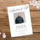 This elegant Celebration of Life invitation features a classic white background, a single square photo, and simple yet elegant typography in white. The back is blank so, if desired, you can add another photo or additional text - just click on "edit with design tool".